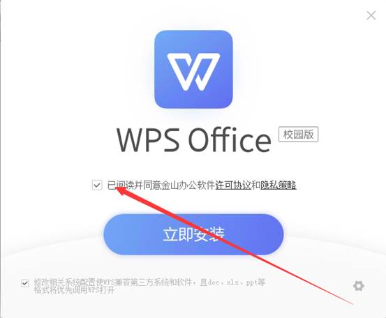 3、勾選已閱讀并同意金山辦公軟件許可協(xié)議和隱私策略。