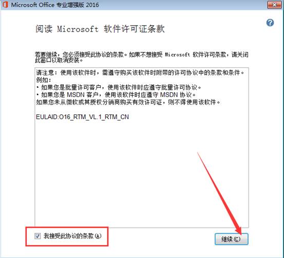 6、勾選“我接受此協(xié)議的條款”,然后點(diǎn)擊繼續(xù)。